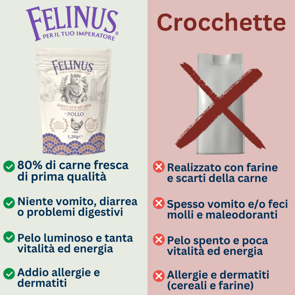 A differenza delle crocchette estruse, il nostro metodo preserva l'integrità dei nutrienti. Questo rende Felinus incredibilmente digeribile, la vera chiave per fermare il vomito e i problemi intestinali.